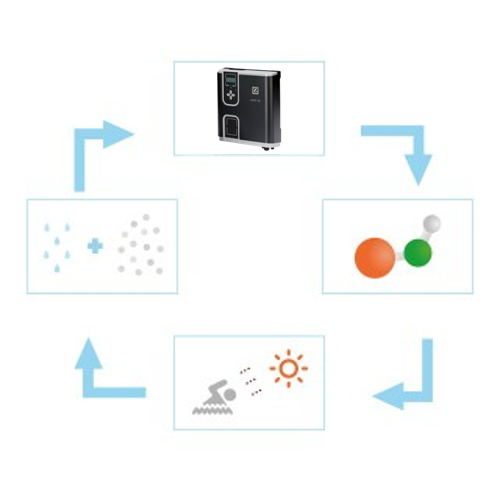 Comme le chlore chimique, le chlore naturel est un puissant oxydant-désinfectant qui élimine les micro-organismes (bactéries, algues…) avec une grande efficacité. Il est diffusé dans la piscine par les buses de refoulement et va procéder au traitement de l’eau. Puis il se transformera à nouveau en sel, une fois exposé aux UV. L’intérêt de ce système est qu’il est cyclique : pas besoin de rajouter de sel en cours de saison (sauf si l’eau est renouvelée).